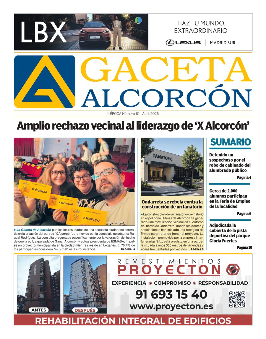 ActualidadHemerotecaSlider Edición Impresa La Gaceta de Alcorcón – ABRIL 2026 Lea nuestra edición impresa en formato digital por Redacción 29 de abril de 2026 escrito por Redacción 3,8K Disponible el nº 10 (II época) de nuestro periódico impreso en formato digital, correspondiente al mes de abril de 2026. versión impresa 0 comentarios 0 FacebookTwitterWhatsappTelegramEmail Redacción noticia anterior Alcorcón adjudica la cubierta de la pista deportiva del parque Gloria Fuertes por más de 300.000 euros Te puede interesar Alcorcón adjudica la cubierta de la pista deportiva... 24 de abril de 2026 Los vecinos rechazan que el partido ‘X Alcorcón’... 21 de abril de 2026 El Torneo del Pepinito reunirá en Leganés a... 14 de abril de 2026 VOX denuncia un vertido ilegal de residuos en... 13 de abril de 2026 Encuesta: ¿Qué te parece que Raquel Rodríguez impulse... 10 de abril de 2026 La Feria de Formación y Empleo de Alcorcón... 10 de abril de 2026 Alcorcón abre la votación final de los presupuestos... 7 de abril de 2026 La presidenta de ESMASA trata de lavar su... 1 de abril de 2026 La Comunidad de Madrid impulsa 42 actuaciones para... 31 de marzo de 2026 Edición Impresa La Gaceta de Alcorcón – MARZO... 30 de marzo de 2026