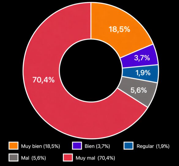 Así, el 70,4% de los participantes considera “muy mal” esta circunstancia, mientras que un 18,5% la valora “muy bien”. Por su parte, un 5,6% la califica como “mal”, el 3,7% como bien y el 1,9% opta por la opción “regular”.